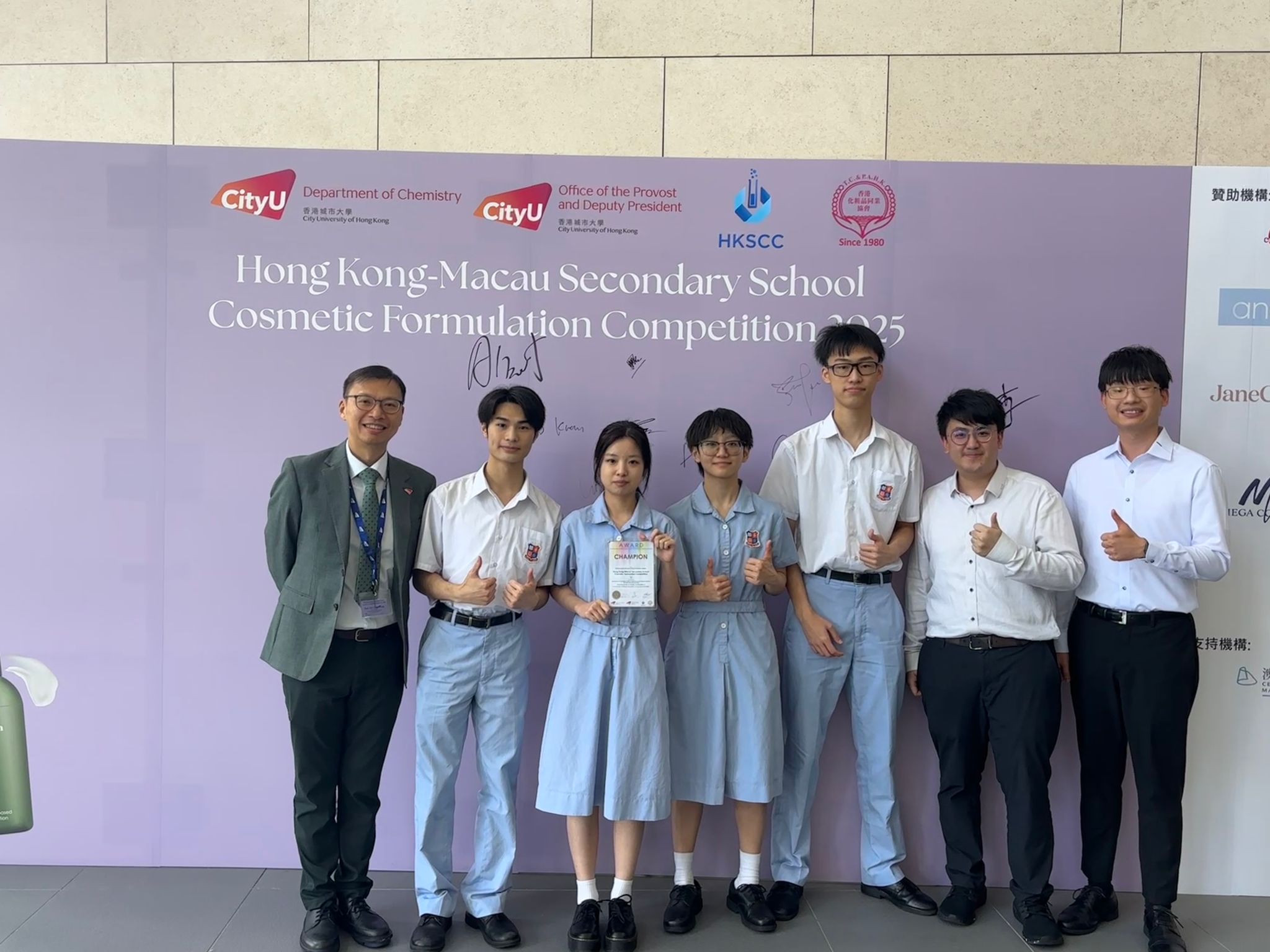 黎綽喬、張景茜、蘇卓桐、何梓軒四位同學在「2025港澳中學化妝品配方比賽」中,以獨創水包油保濕乳液橫掃120+強敵,勇奪冠軍! 產品結合「深層保濕+瞬吸不黏膩」黑科技,通過安全與質地測試,連評審都驚艷!