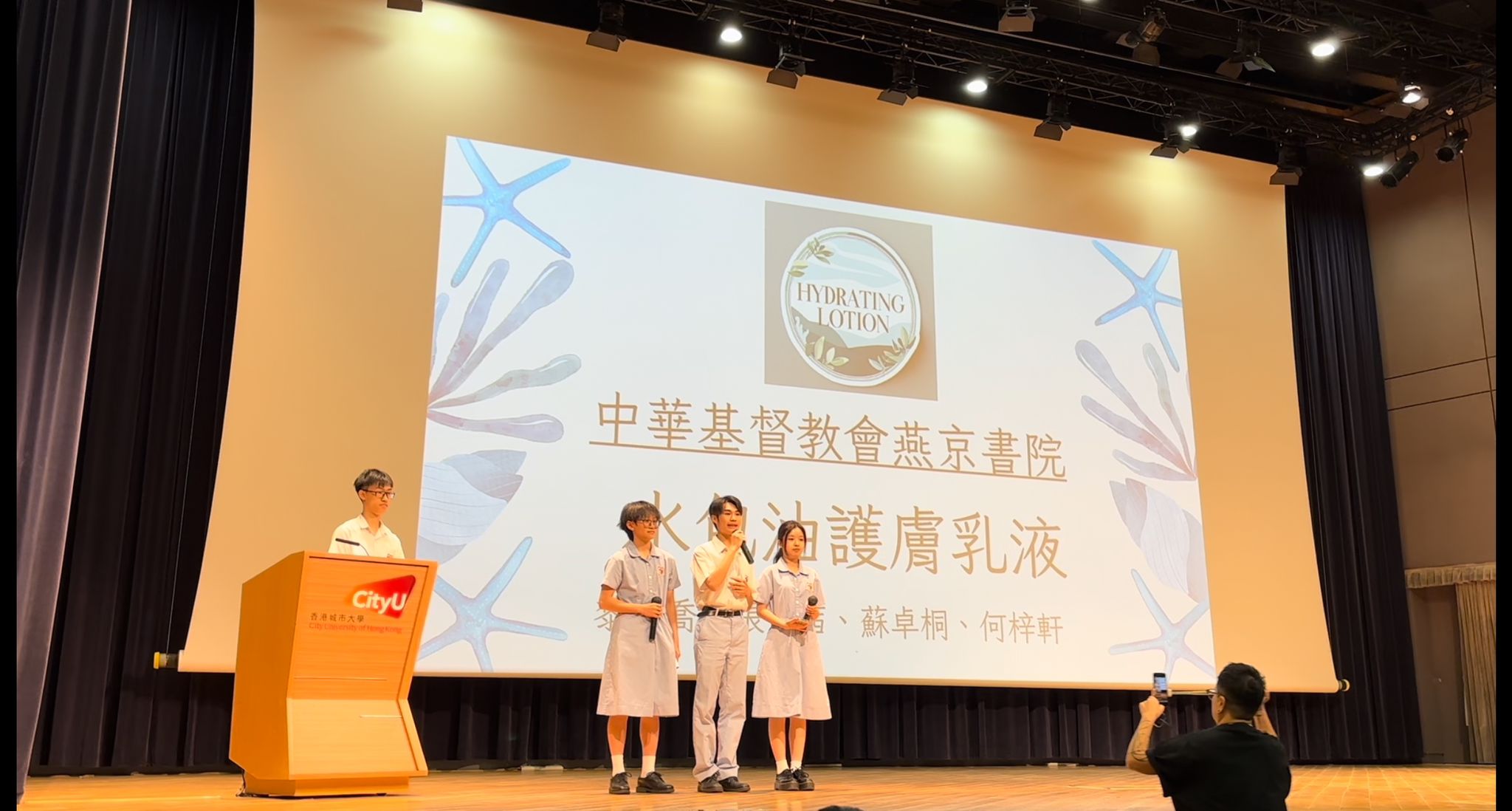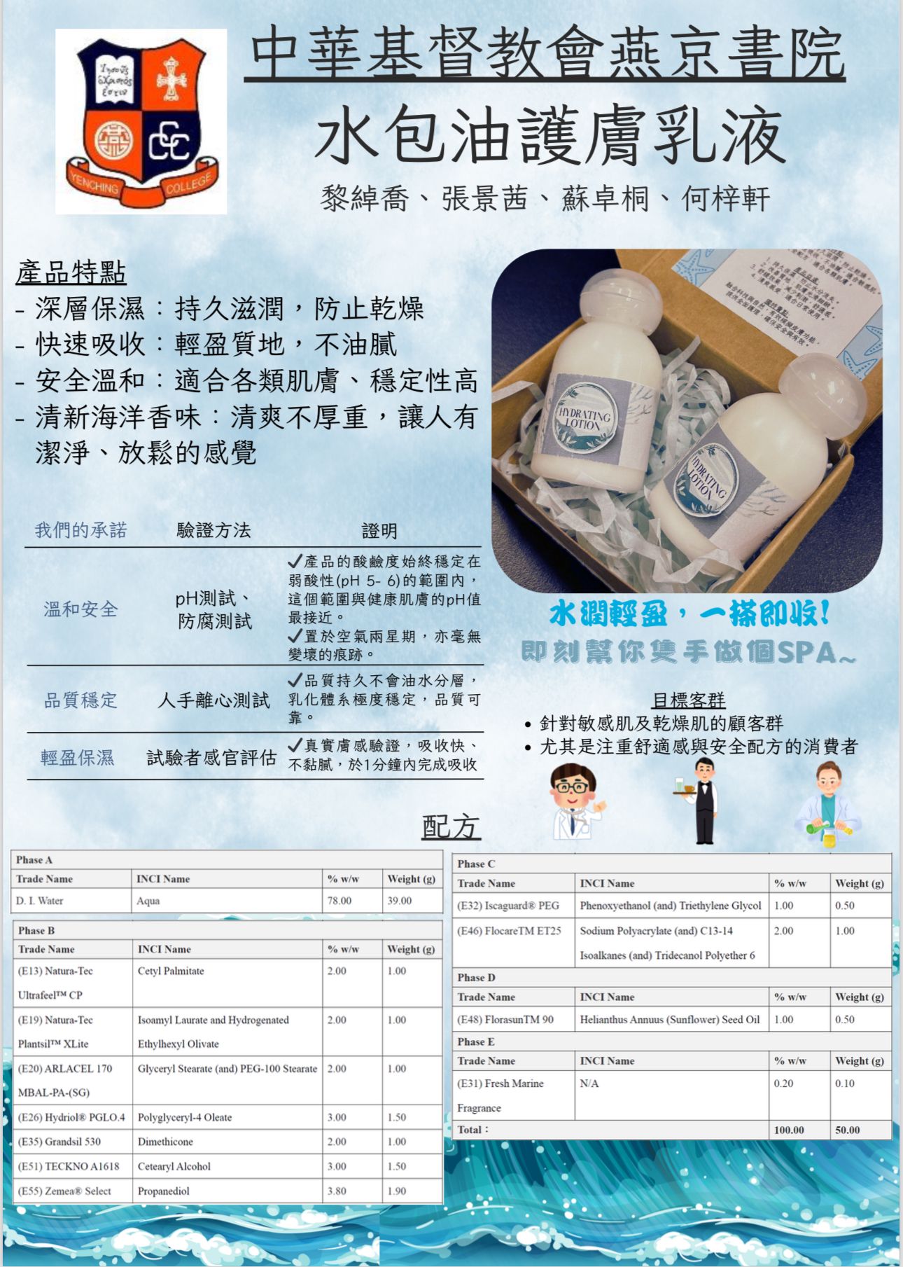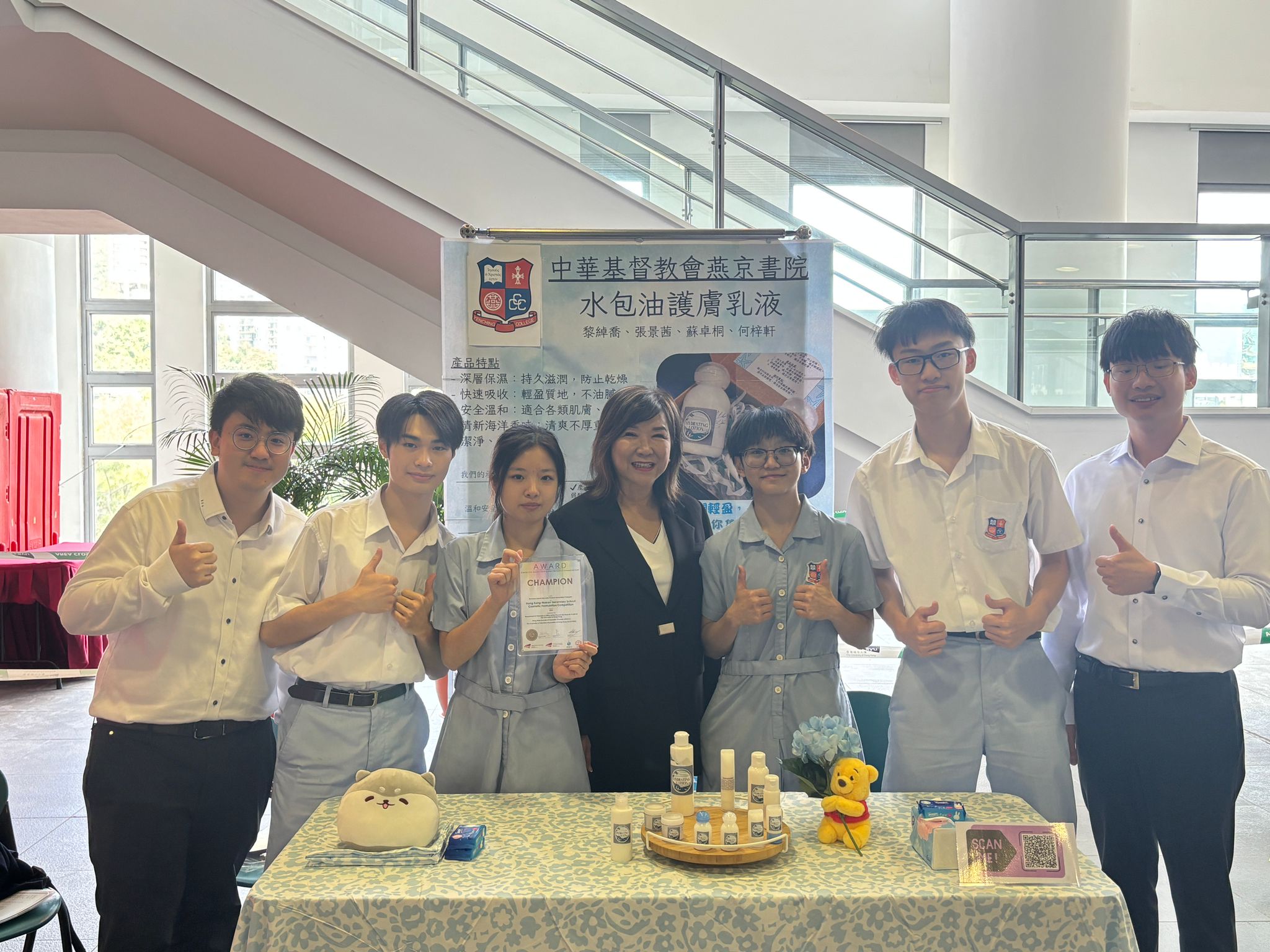 黎綽喬、張景茜、蘇卓桐、何梓軒四位同學在「2025港澳中學化妝品配方比賽」中,以獨創水包油保濕乳液橫掃120+強敵,勇奪冠軍! 產品結合「深層保濕+瞬吸不黏膩」黑科技,通過安全與質地測試,連評審都驚艷!